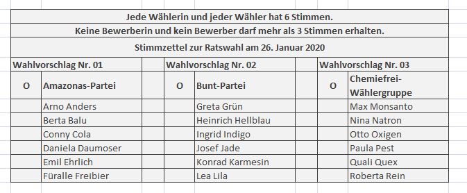 Alle Anwesenden waren zur geheimen Wahl aufgerufen und warfen ihren Stimmzettel in die Wahlbox. Erfahrene Erstwähler vermuteten, dass Kandidat „Füralle Freibier“ das Rennen machen wird. Nicht ganz klar ist das Geschlecht, weil „Füralle“ ja auch ein exotischer weiblicher oder männlicher Name sein könnte. Auch bei den offiziellen Wahllisten ist das Geschlecht nur indirekt über die Berufsbezeichung ersichtlich z.B. Sachbearbeiterin oder Lehrer.